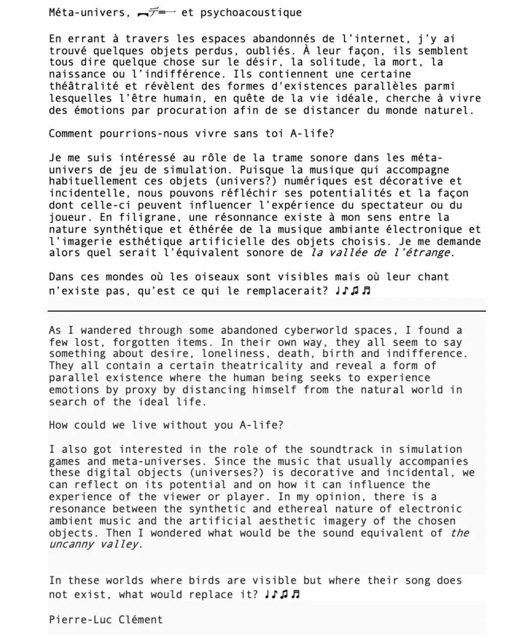 Étude sur la narrativité accidentelle dans les méta-univers, les trames sonores de jeux de simulation et des potentiels de la poésie automatique générée par l’intelligence artificielle (Youtube.com). Dans ces mondes où les oiseaux sont visibles mais où leur chant n’existe pas, qu’est ce qui le remplacerait? ♩ ♪ ♫ ♬
